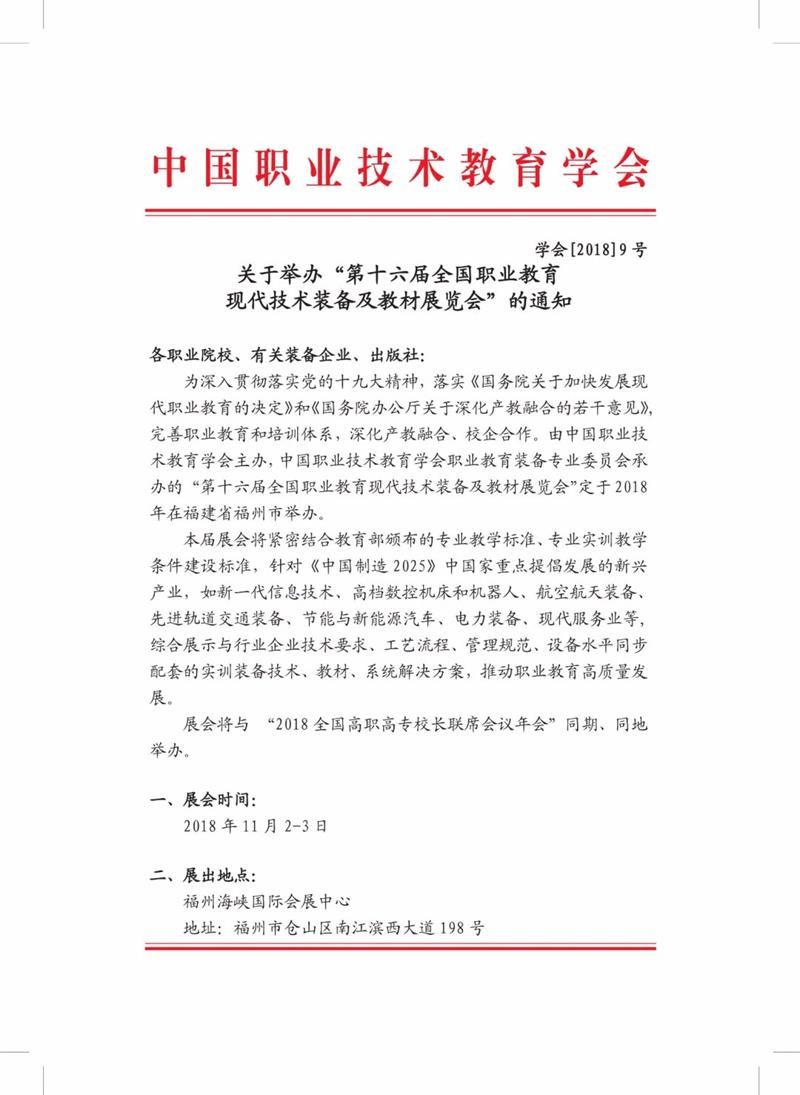 由中國(guó)職業(yè)技術(shù)教育學(xué)會(huì)主辦,中國(guó)職業(yè)技術(shù)教育學(xué)會(huì)職業(yè)教育裝備專業(yè)委員會(huì)承辦的“第十六屆全國(guó)職業(yè)教育現(xiàn)代技術(shù)裝備及教材展覽會(huì)”定于2018年在福建省福州市舉辦,本屆展會(huì)將緊密結(jié)合教育部頒布的專業(yè)教學(xué)標(biāo)準(zhǔn)、專業(yè)實(shí)訓(xùn)教學(xué)條件建設(shè)標(biāo)準(zhǔn),針對(duì)《中國(guó)制造2025) 中國(guó)家重點(diǎn)提倡發(fā)展的新興產(chǎn)業(yè),如新一代信息技術(shù)、高檔數(shù)控機(jī)床和機(jī)器人、航空航天裝備、先進(jìn)軌道交通裝備、節(jié)能與新能源汽車、電力裝備、現(xiàn)代服務(wù)業(yè)等,綜合展示與行業(yè)企業(yè)技術(shù)要求、工藝流程、管理規(guī)范、設(shè)備水平同步配套的實(shí)訓(xùn)裝備技術(shù)、教材、系統(tǒng)解決方案,推動(dòng)職業(yè)教育高質(zhì)量發(fā)展。