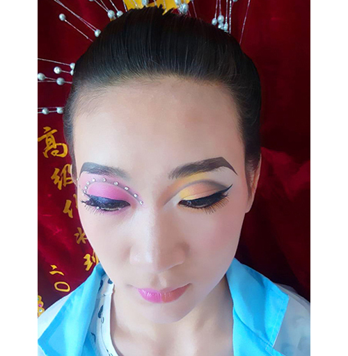 將腮紅呈水平45°角從顴骨下方到太陽穴的位置打出斜線狀的腮紅,先在兩頰刷上深色的扇形腮紅,再于上方重疊淺色斜長腮紅。選擇較深色的腮紅,刷在耳際到頰骨的位置,范圍可略微向內(nèi)延伸到顴骨的下方,會讓臉型看起來更立體。