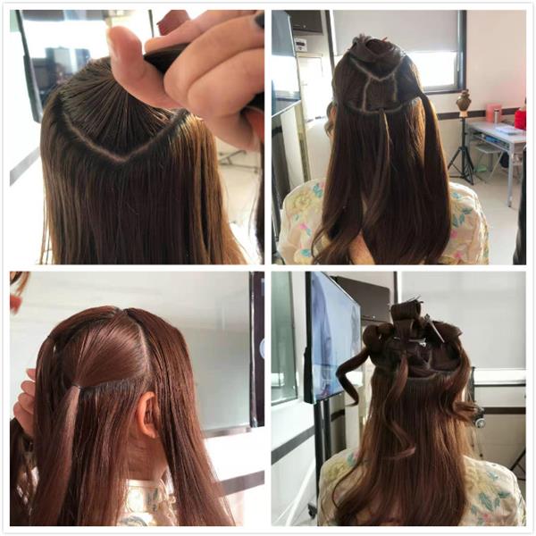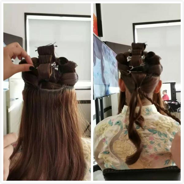2.然后我們用卷筒的方式把后邊的頭發(fā)像堆積木的方式疊起來。由低到高一點一點慢慢變小
