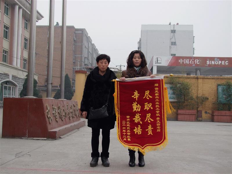 2016年12月12日,就讀測繪30班學(xué)生胡波的家長來到保定新興工業(yè)技工學(xué)校,滿含深情地給孩子的班主任李文茹老師送來了“盡職盡責(zé),辛勤栽培”的錦旗,表示對老師的深深謝意..