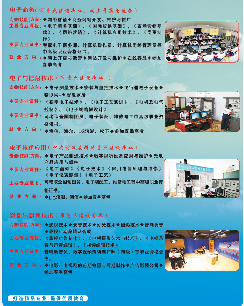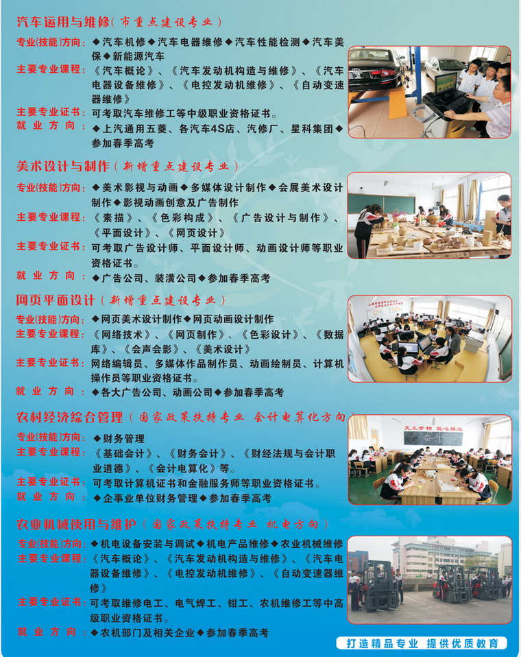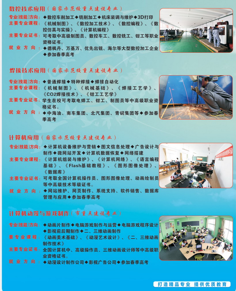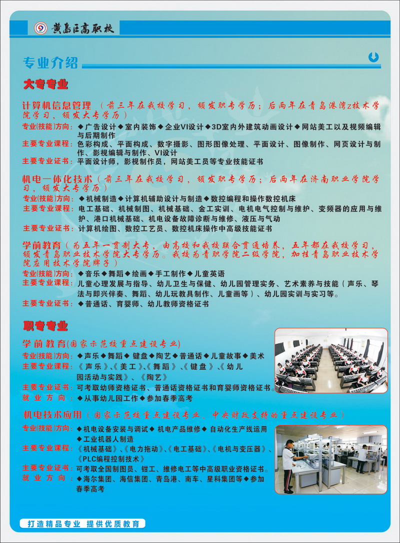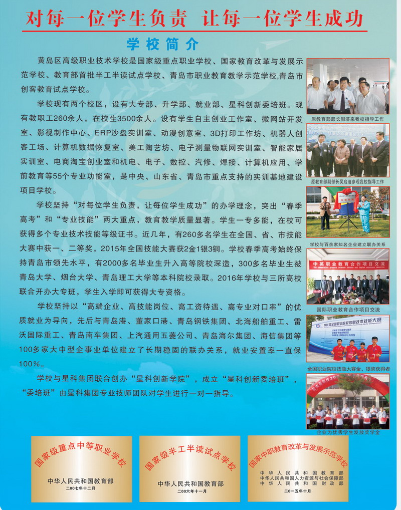 青島黃島區(qū)高級(jí)職業(yè)技術(shù)學(xué)校(原膠南市現(xiàn)合并為青島市黃島區(qū))是國(guó)家級(jí)重點(diǎn)職業(yè)學(xué)校、國(guó)家教育改革與發(fā)展示范學(xué)校、教育部首批半工半讀試點(diǎn)學(xué)校、青島市職業(yè)教育教學(xué)示范學(xué)校。 學(xué)?,F(xiàn)有兩個(gè)校區(qū),設(shè)有“3+2”和“2+3”大專部、升學(xué)部、就業(yè)部、工學(xué)部,在校生4500人。建有機(jī)電、電子、數(shù)控、焊接、汽車維修、計(jì)算機(jī)應(yīng)用、學(xué)前教育等55個(gè)專業(yè)功能室,是中央、山東省、青島市重點(diǎn)支持的實(shí)訓(xùn)基地建設(shè)項(xiàng)目學(xué)校。 學(xué)?,F(xiàn)有教職工260多人,市級(jí)以上優(yōu)秀教師、教學(xué)能手、骨干教師、優(yōu)秀專業(yè)人才等80多人。學(xué)校實(shí)行“訂單式辦學(xué),軍事化管理,開放式教學(xué)”,教育教學(xué)質(zhì)量顯著。學(xué)生在???.