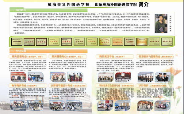 山東威海外國語進(jìn)修學(xué)院學(xué)校概況 山東威海外國語進(jìn)修學(xué)院(威海景義外國語學(xué)校)始建于1988年,學(xué)校始建于1988年,原名文登中日友好日語中等專業(yè)學(xué)校、民辦文登外語學(xué)校,是山東省早創(chuàng)設(shè)的民辦外語院校。學(xué)校具有職業(yè)中專、普通中專、非學(xué)歷高等教育、南開大學(xué)現(xiàn)代遠(yuǎn)程教育辦學(xué)資格。 山東威海外國語進(jìn)修學(xué)院坐落于威海市文登區(qū),占地76畝,建筑面積16000平方米,教學(xué)班30個(gè),在校生1000余名,其中外國留學(xué)生32人;教職員工61人,其中外教5人。設(shè)商務(wù)英語、商務(wù)日語、商務(wù)韓語、電子商務(wù)、計(jì)算機(jī)平面設(shè)計(jì)、農(nóng)村經(jīng)濟(jì)綜合管理等專業(yè),其中商務(wù)韓語、日語專業(yè)系威海市中等職業(yè)技術(shù)學(xué)校..