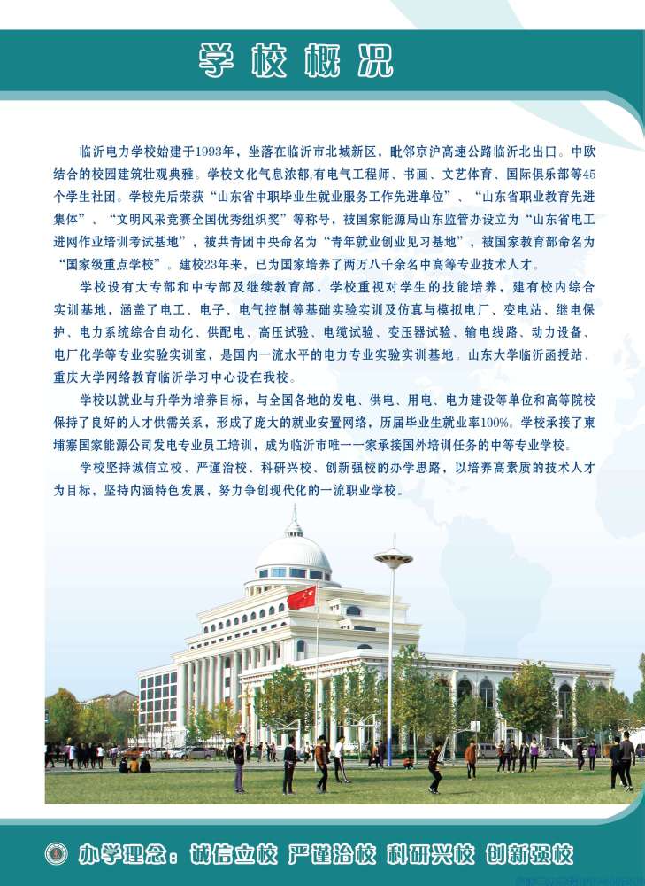國家級(jí)重點(diǎn)學(xué)校 山東省高水平學(xué)校 一、臨沂電力學(xué)校概況 臨沂電力學(xué)校始建于1993年,系國家級(jí)重點(diǎn)學(xué)校、山東省示范性中職學(xué)校、山東省首批高水平中等職業(yè)學(xué)校、山東省首批五年制高等職業(yè)教育試點(diǎn)專業(yè)學(xué)校。在校生5100余人,學(xué)校規(guī)模和綜合實(shí)力在全國電力類中職學(xué)校中位居前列,是全國電力職業(yè)教育指導(dǎo)委員會(huì)委員單位。 學(xué)校專業(yè)特色鮮明。設(shè)有五年制高職(大專)和中專兩個(gè)辦學(xué)層次,設(shè)立就業(yè)班和高考班。開設(shè)熱能動(dòng)力工程技術(shù)、電力系統(tǒng)自動(dòng)化技術(shù)、電氣自動(dòng)化技術(shù)、新能源裝備技術(shù)、分布式發(fā)電與智能微電網(wǎng)技術(shù)、電廠集控運(yùn)行、火電廠熱力設(shè)備運(yùn)行與檢修、發(fā)電廠及變電站運(yùn)行與維護(hù)..