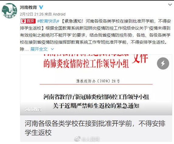 河南教育 緊急通知:各地、各級(jí)、各類學(xué)校在接到省疫情防控指揮部教育系統(tǒng)工作專班批準(zhǔn)開學(xué)前,不得安排學(xué)生返校。除需要返校參加本校疫情防控工作的教職工外,不得安排其他教職工返校。開學(xué)時(shí)間以正式批準(zhǔn)的方案為準(zhǔn)。