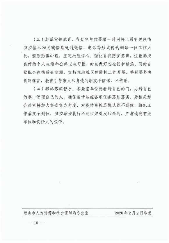 唐山市人社局關(guān)于印發(fā)《強化新型冠狀病毒感染的肺炎疫情防控的工作方案》的通知