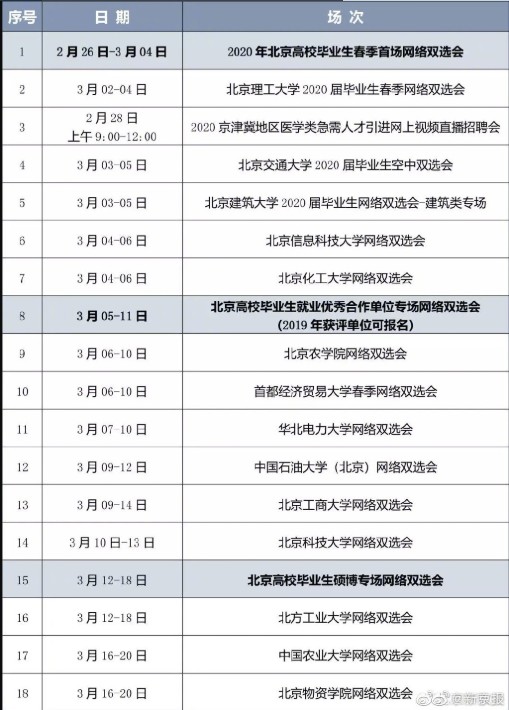自2020年2月26日起,不同主題的網(wǎng)絡(luò)雙選會(huì)將陸續(xù)舉辦,每場(chǎng)雙選會(huì)持續(xù)時(shí)間為3-7天。